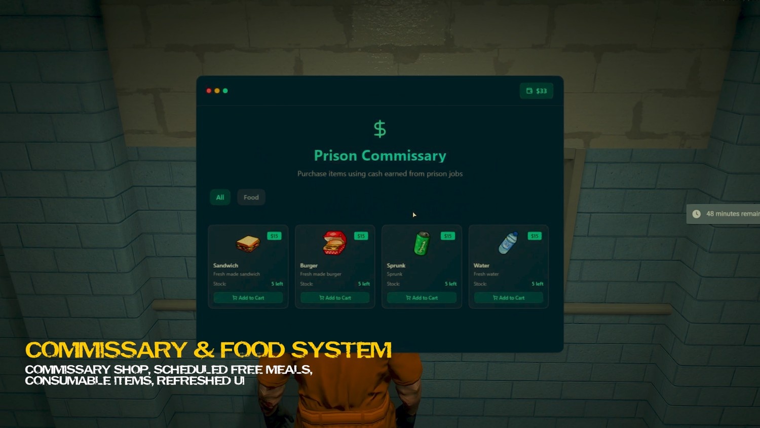 Inmates can purchase food and basic items from the prison commissary using money earned from prison jobs. Free meals are also served on a schedule, giving prisoners multiple ways to stay fed. The system keeps things simple and immersive, with consumable items and a refreshed, easy-to-use interface.