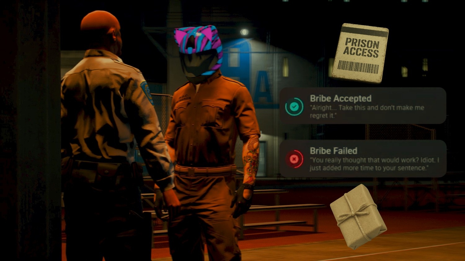 Inmates can attempt to bribe a prison guard using a bribe package that can be crafted or traded for inside the prison. There is always a risk involved. If the guard refuses the bribe, extra time will be added to your sentence. If the bribe is accepted, the guard provides a keycard that can be used to help escape the prison.