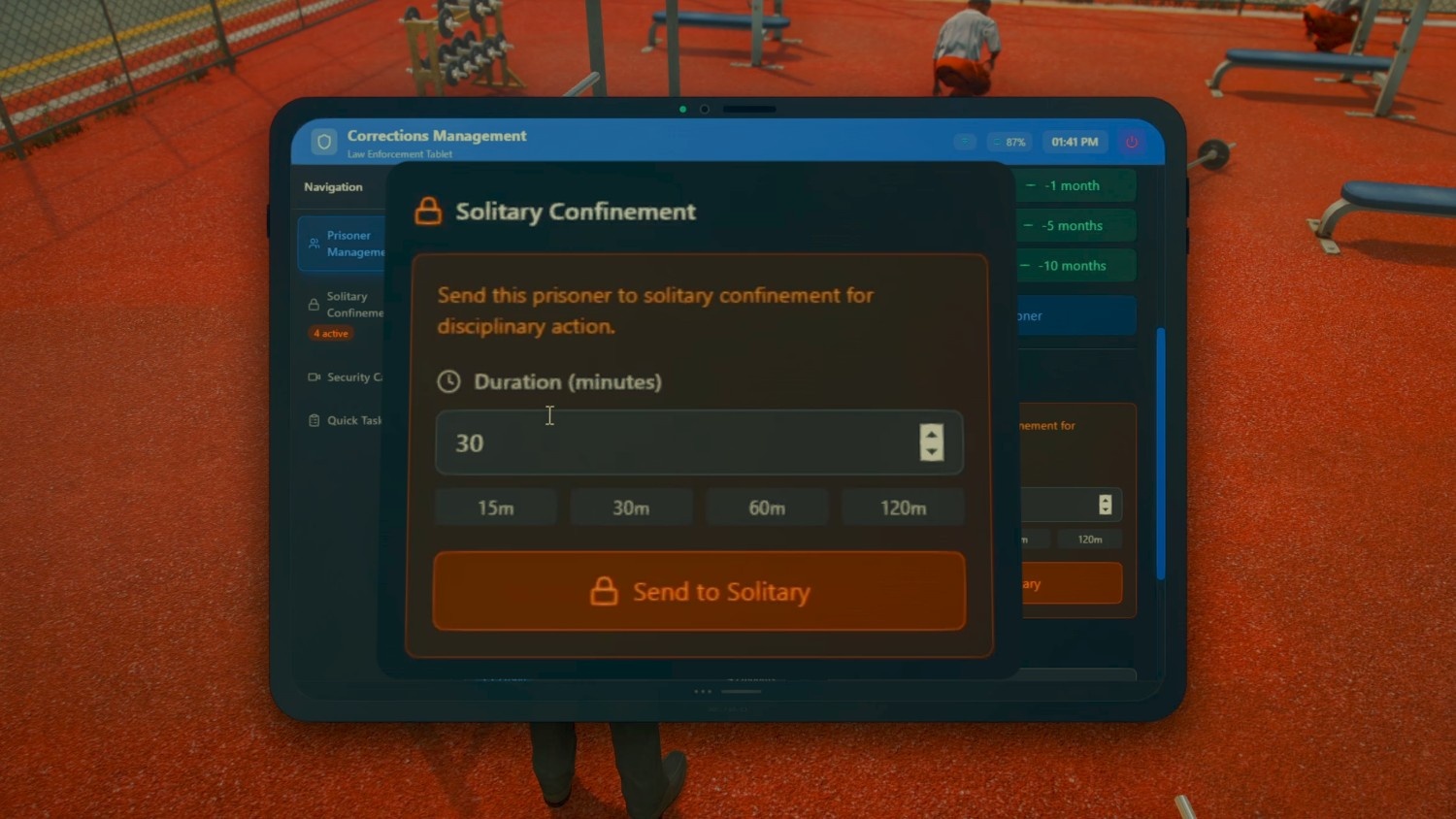 Correctional officers can send inmates to solitary confinement as a form of disciplinary action. Time can be set manually or chosen from preset durations, keeping punishment controlled and fair. Solitary removes the inmate from normal prison activities, reinforcing consequences while staying immersive and realistic for roleplay.