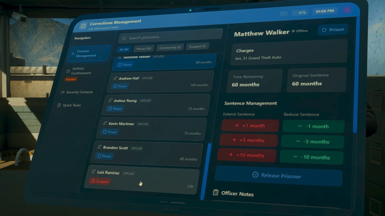 Manage prisoners directly from a modern corrections tablet. View inmate records, charges, and remaining time, make sentence adjustments, and handle releases with ease. Designed to feel natural during roleplay while giving officers full control over prison operations.