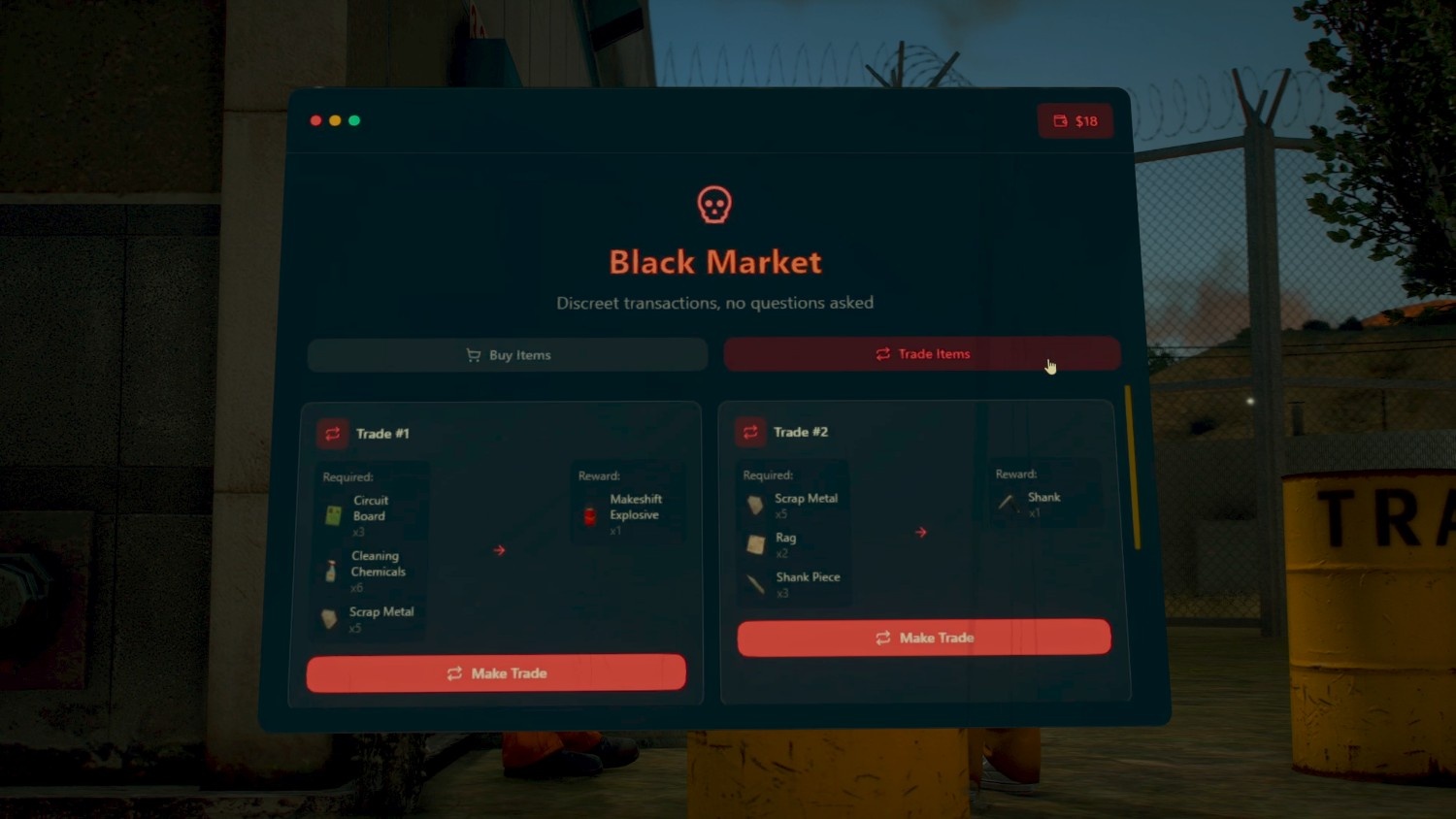 A hidden black market where inmates can buy or trade illegal items through discreet deals. Trades can be used to obtain contraband, craft materials, or bribe correctional officers when the opportunity arises. The system is designed to feel risky, secretive, and true to prison roleplay, adding depth and real consequences to inmate choices.